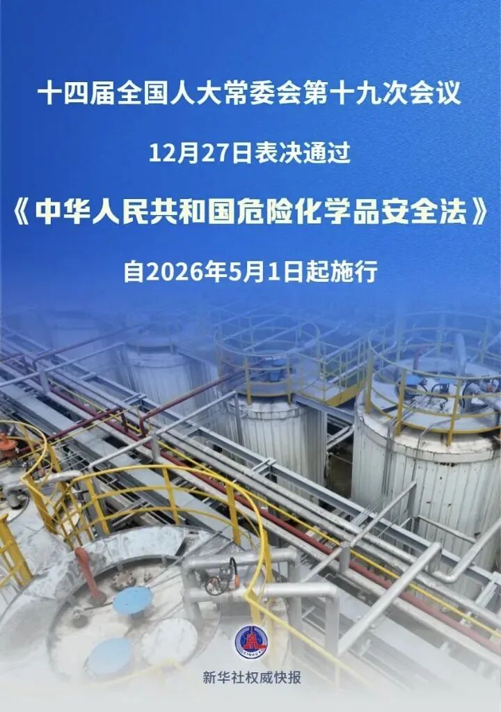十四届全国人大常委会第十九次会议12月27日表决通过危险化学品安全法,自2026年5月1日起施行。这将为加强危险化学品安全管理、预防和减少危险化学品事故提供有力支撑。